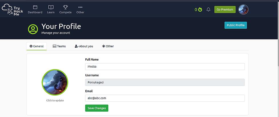 sağ üst köşede bulunan public profile butonuna tıkladığınızda Nick , badges ,toplam bitirilmiş oda sayısı , rank , paylaşılabilir profil bağlantısı(tryhackme ye üye olmayanlarda görebilir) ,yıllık aktivite, tickets ,created rooms , ve level bilgisine ulaşabiliriz